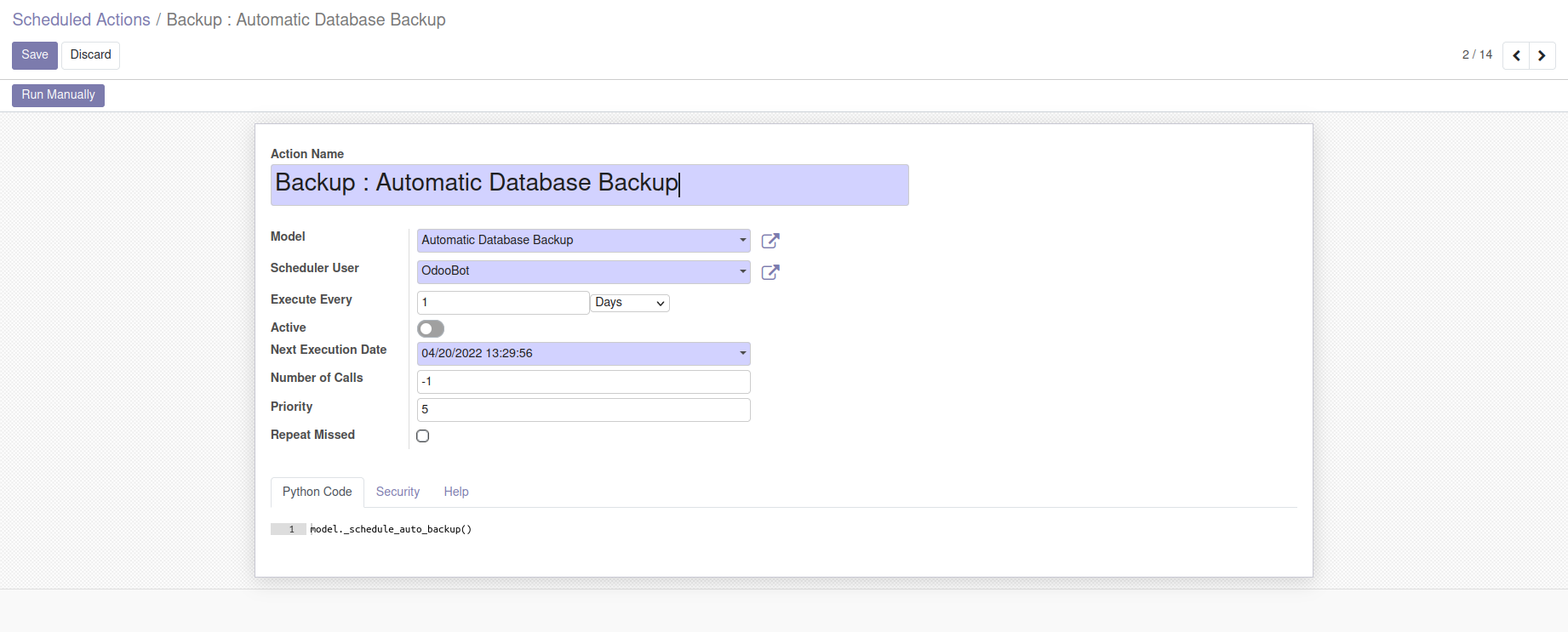 Enable the 'Automatic database Backup' scheduled action, and set up the execution interval. Based on the scheduled action setup, backups will be generated on regular intervals.