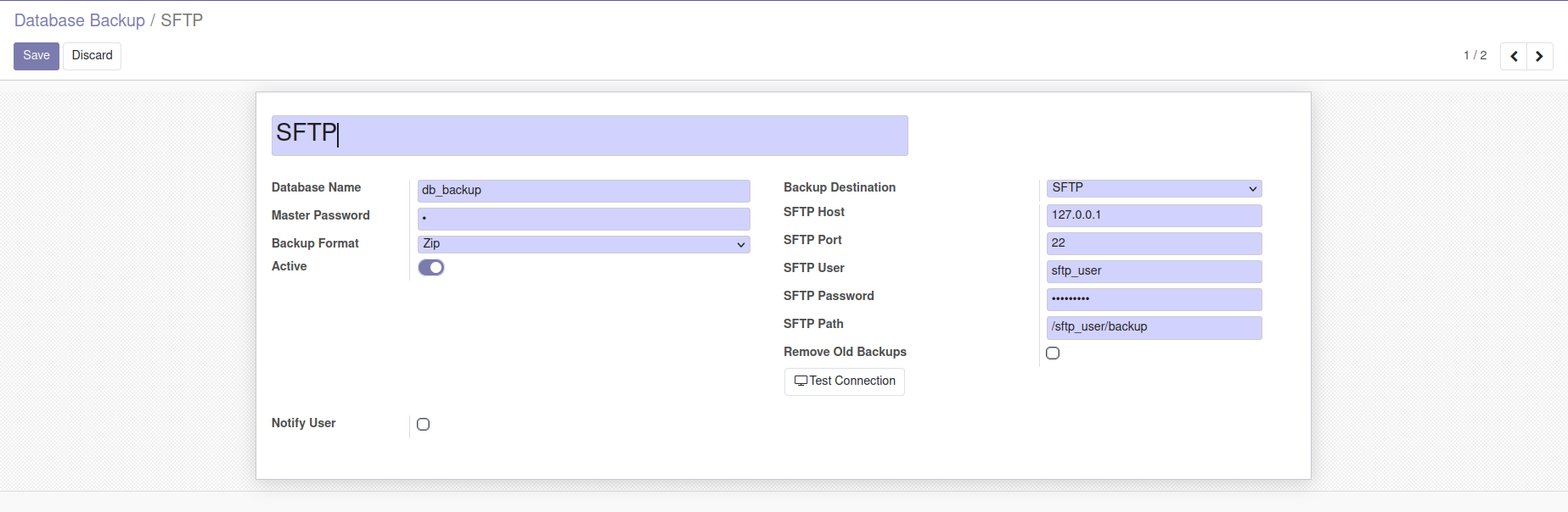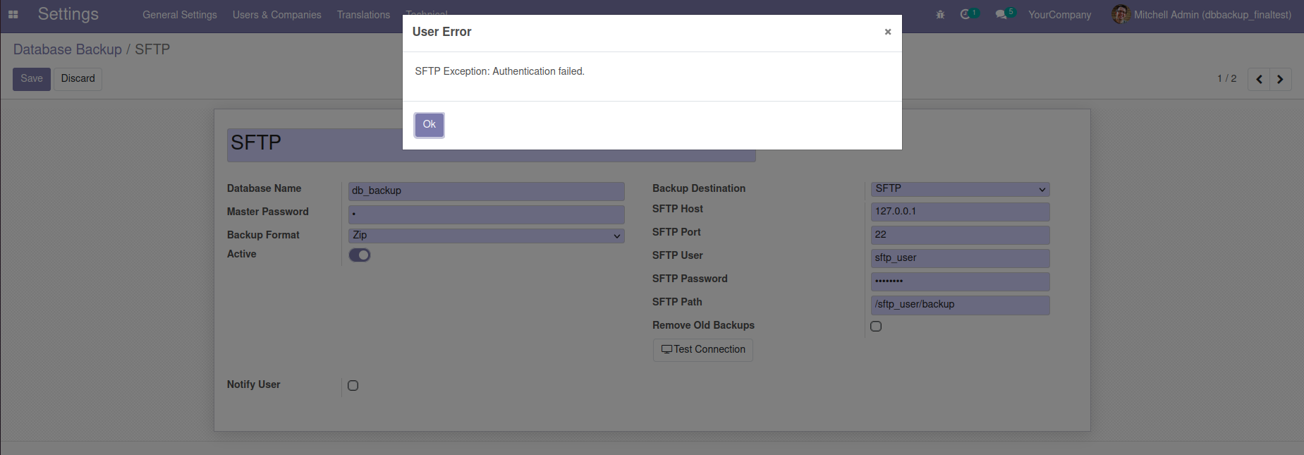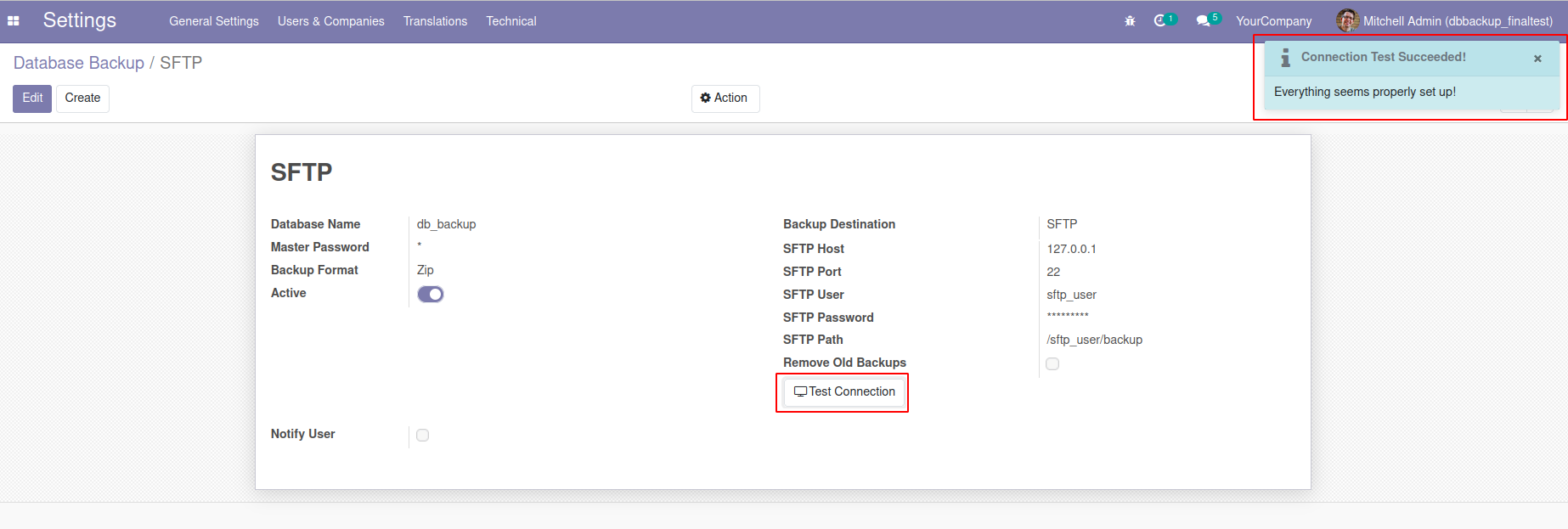 Select backup destination as SFTP, enter credentials. Test connection button to check whether the connection is successful.