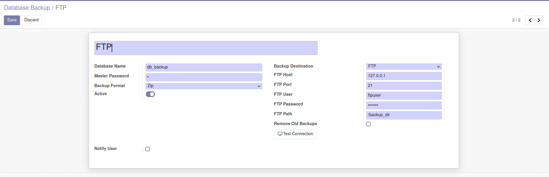 Select backup destination as FTP, enter credentials. Test connection button to check whether the connection is successful.
