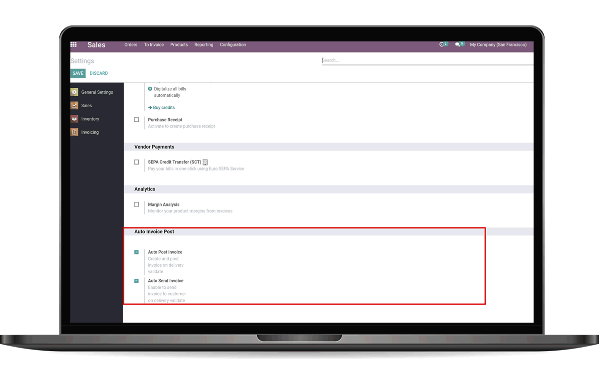 User can see invoice is validated automatically and sent message is linked with chatter which is sent to customer.