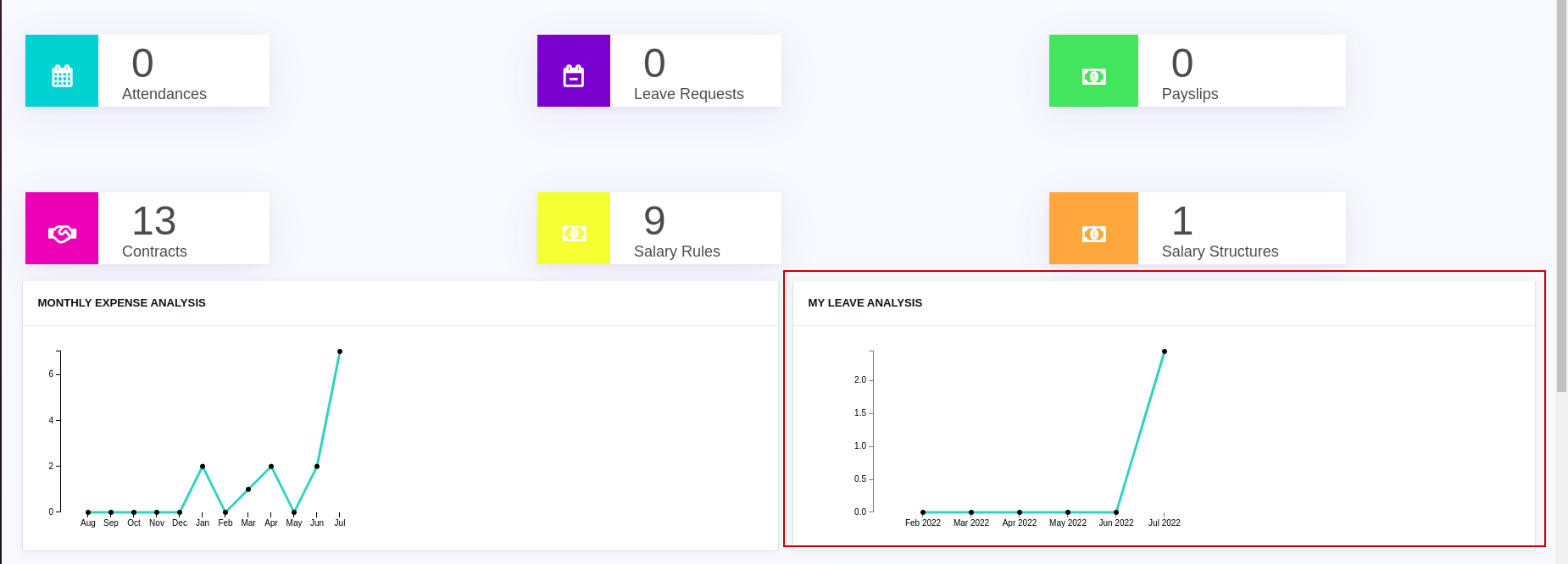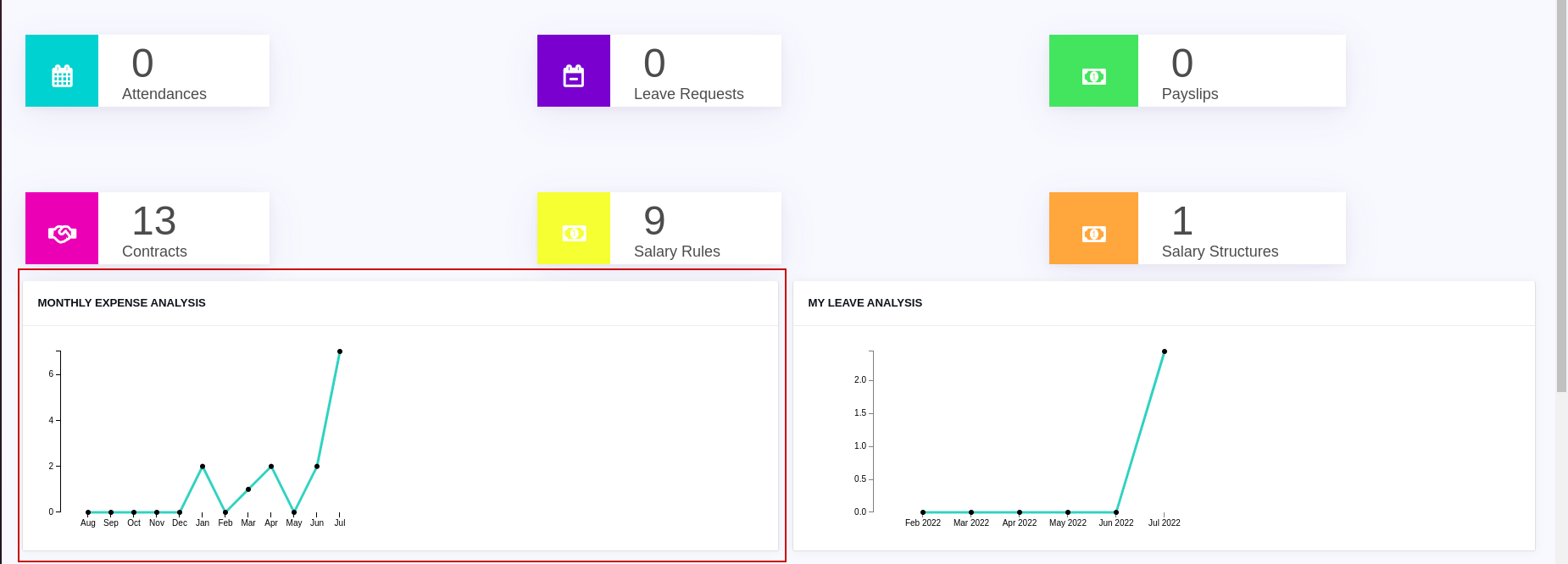 This module helps you to see the Overview of Payroll, here You can see the details of Attendance, Leaves, Payslip contracts, etc.