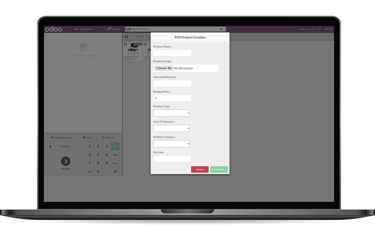 The module provisions the end user to create products directly from Point of Sale. The new button "Create Product", shall enable the end user to add details such as product name, product image, internal reference, price, type, category, barcode and more from POS. Upon clicking the confirm button, a new product shall be created based on provided details.