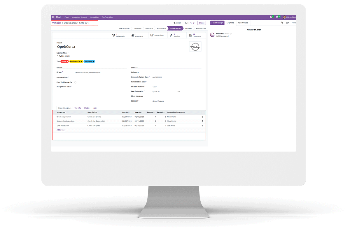 In Fleet -> Vehicles ->have 'Inspection Lines' Tab,here we can add inspections for that vehicle.