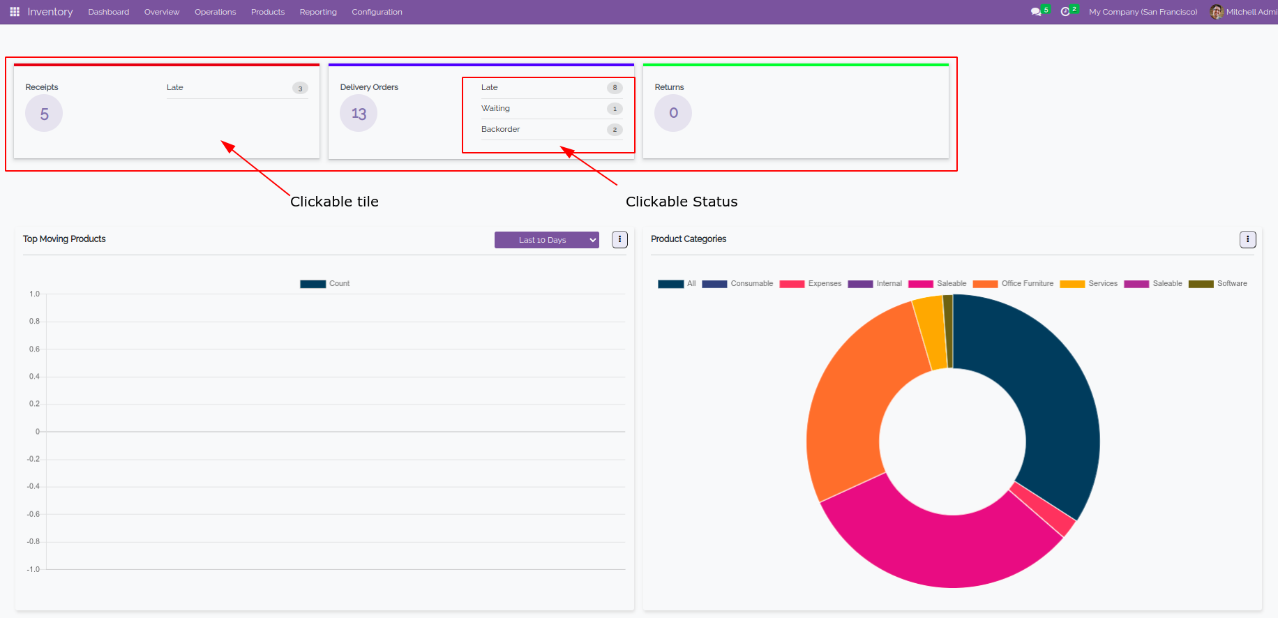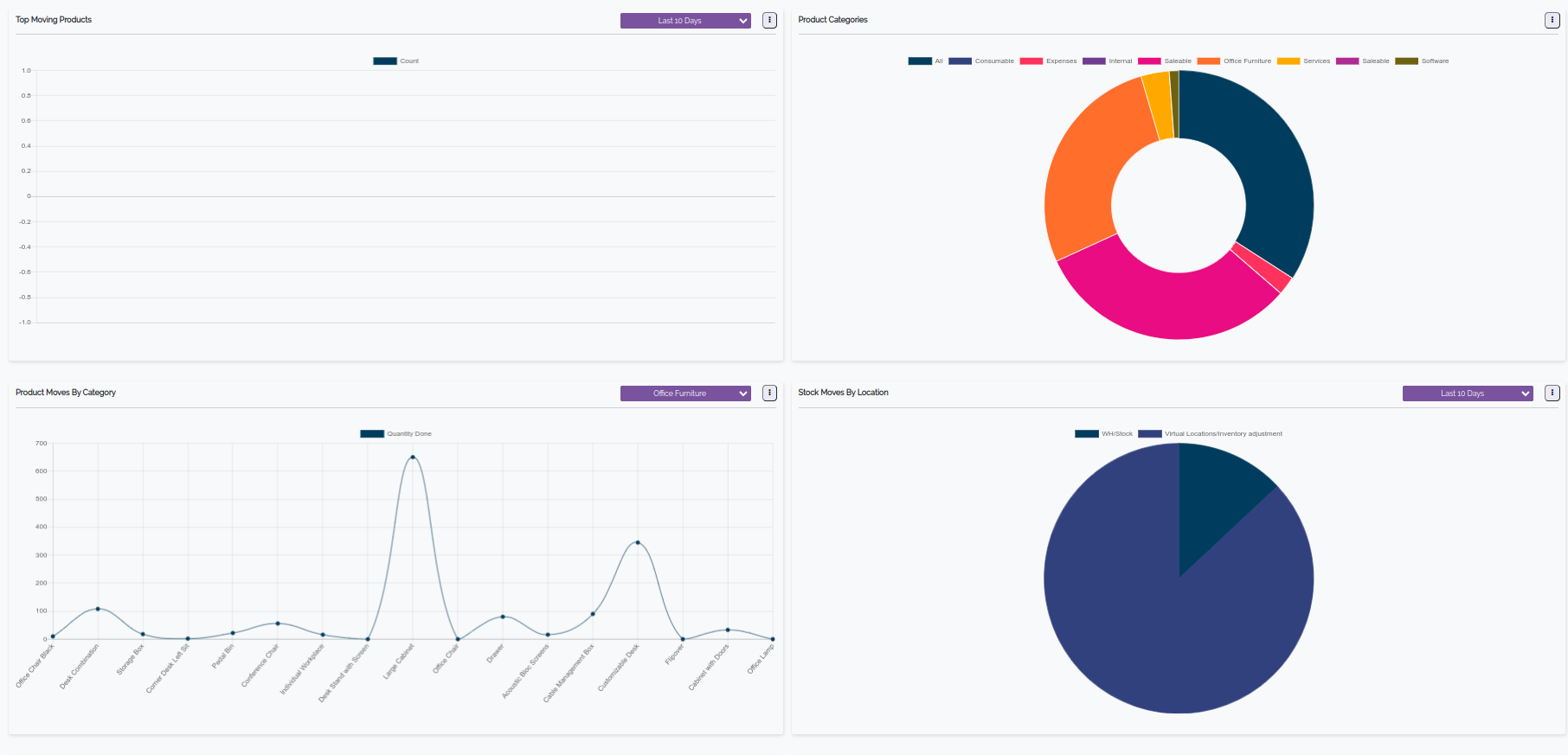 Inventory dashboard have different types of graphs that will give you complete analyse of the inventory module.