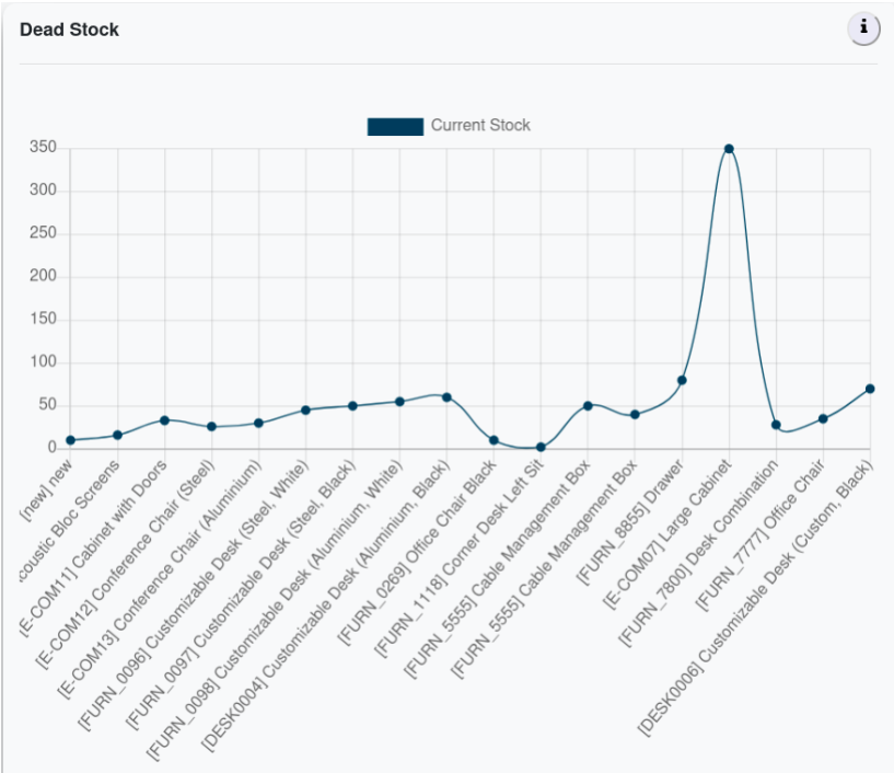 Graphs shows the Dead stock Products and their Current stock.