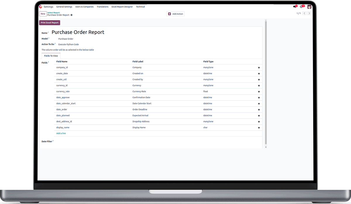 The reports can be configured and printed using the 'Excel Report Designer' menu at Settings. Select the desired model on which you want to create report, select the required fields and filter using any of the date field in the model.