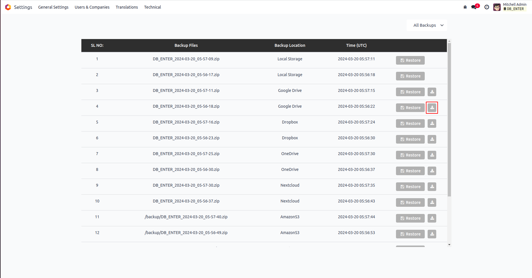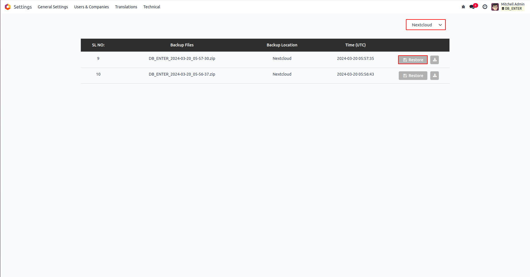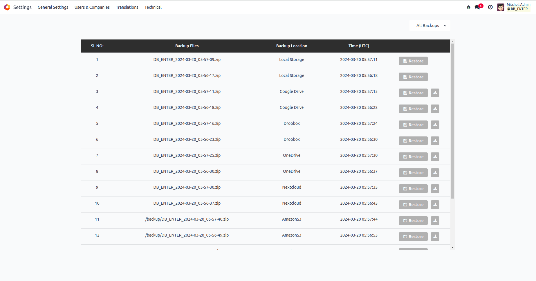 Go to Setting --> Technical --> Backup Configuration to configure backups.
