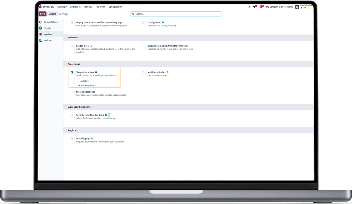 Go to Inventory -> Configurations -> Settings ->Storage Locations Enable the Storage Locations.