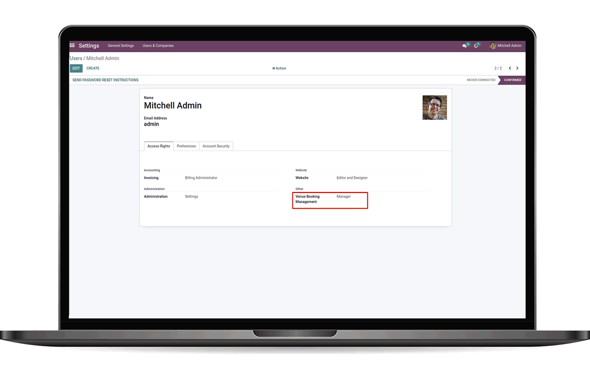 CREATE INVOICE,SEND MAIL,RESET TO DRAFT buttons are available in the Venue Booking CONFIRMED State