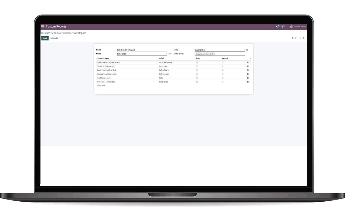 In the Custom Pivot Report App, user can configure the menu, fields, and security for pivot reports. A user can easily set rows and measures for the pivot report.