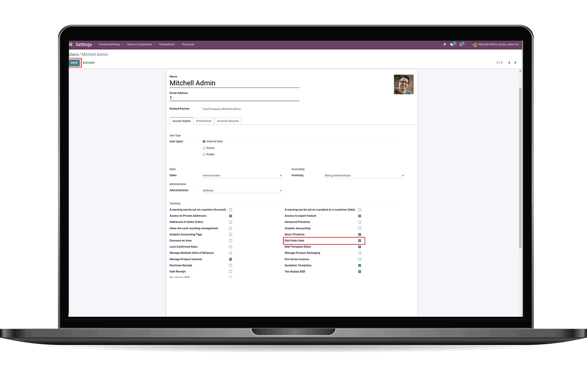 First we have to set the user groups for editing the field 'Order Date'. For that go to the General Settings. General Settings -> Users & Companies. Select the user who can edit the field. Under the 'Technical' section enable the 'Edit Order Date' and 'SAVE' the record.