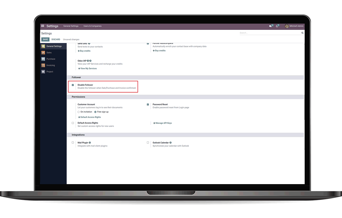 While confirming a Purchase order, we can see that only the user is added to the follower. Here the vendor is restricted to be a follower.