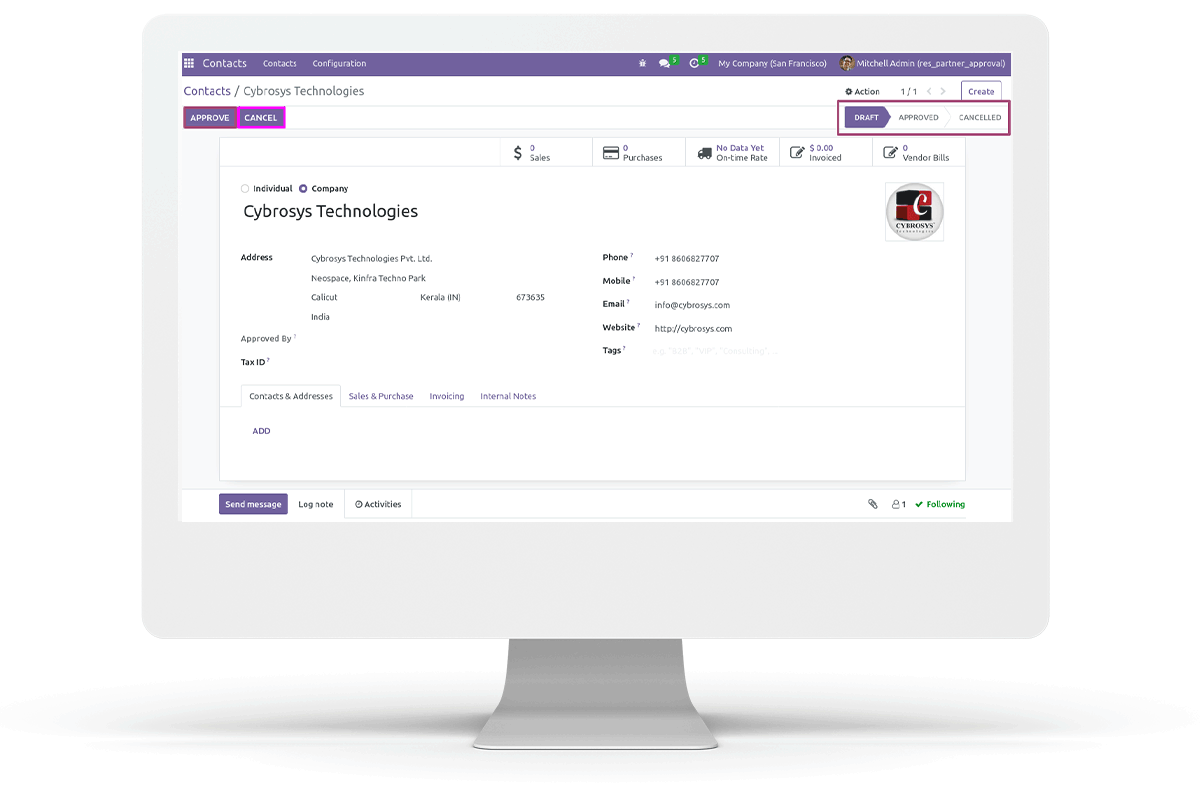 The Odoo Contact Approval Module allows you to approve or cancel contacts through the Contacts Approval Manager. Only Approved contacts can be used in sales, purchasing, inventory, and invoice models.