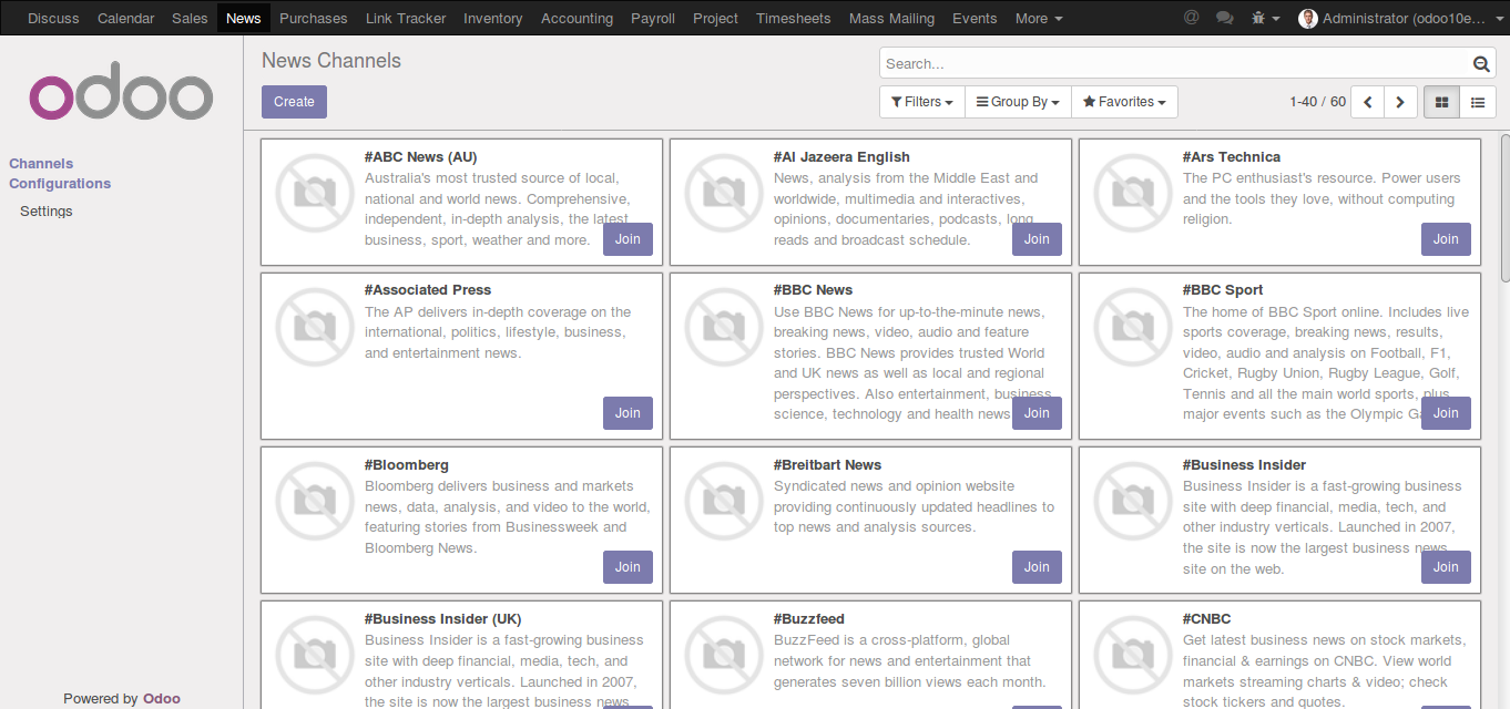 Subscribe to various news Channels provided under custom menu "NEWS". Subscribed News channels will be listed under Discuss Menu.