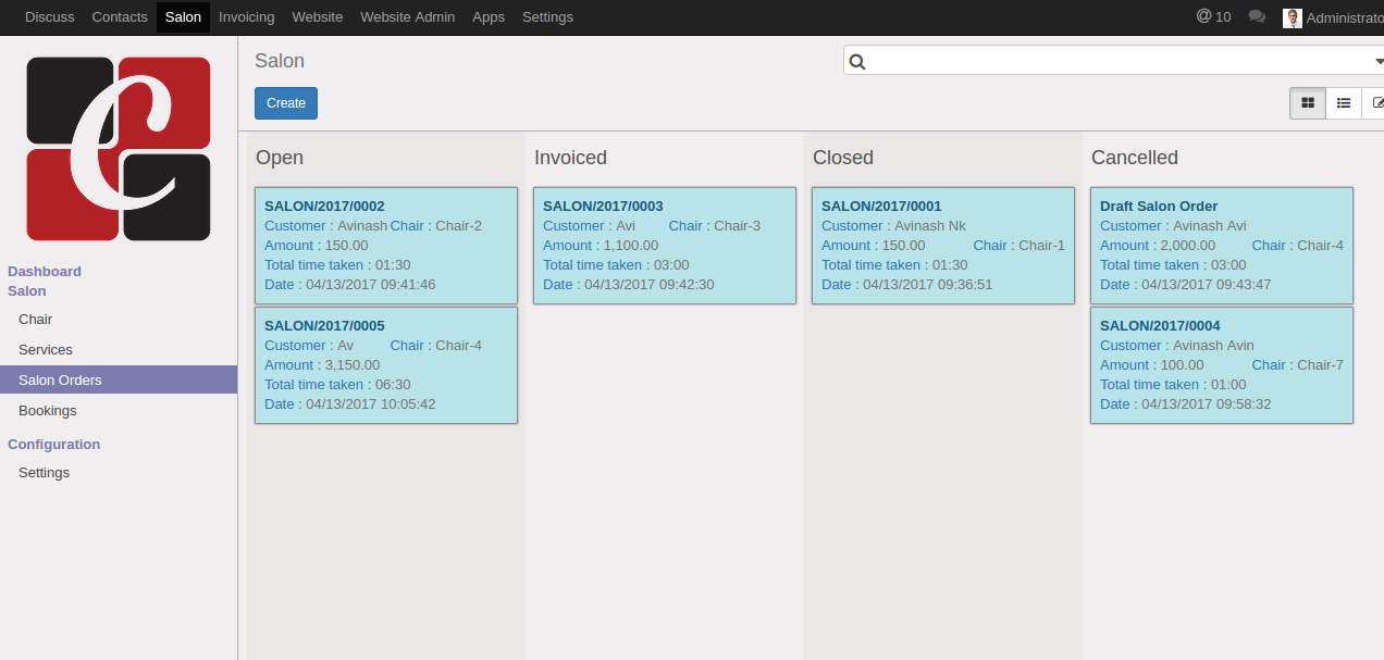 Form view of the salon order is shown in the image. You will get the corresponding invoice details of the order by clicking the Invoice button in the upper right side of the form view.