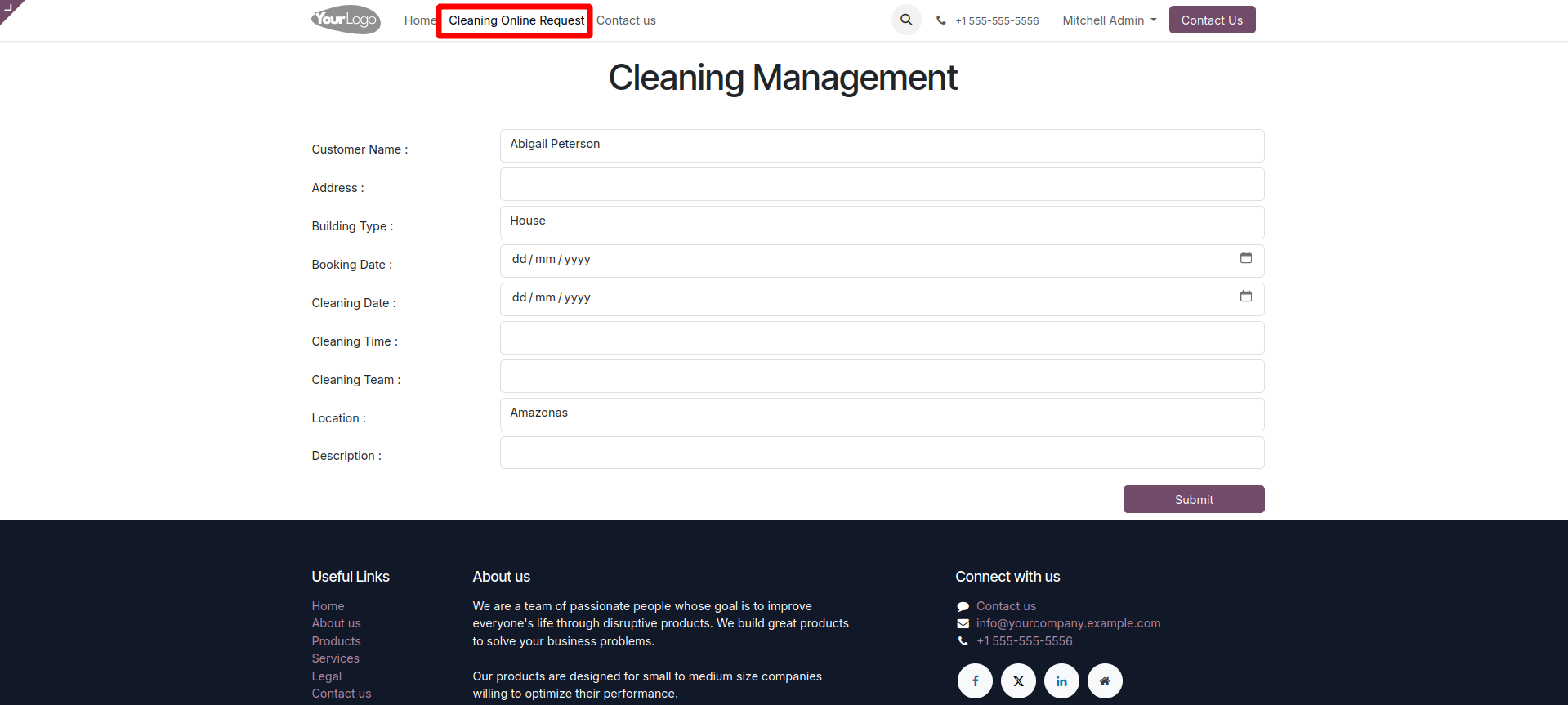 When you click on 'Cleaning Online Request,' a form will appear, allowing you to book Cleaning processes by providing your details.