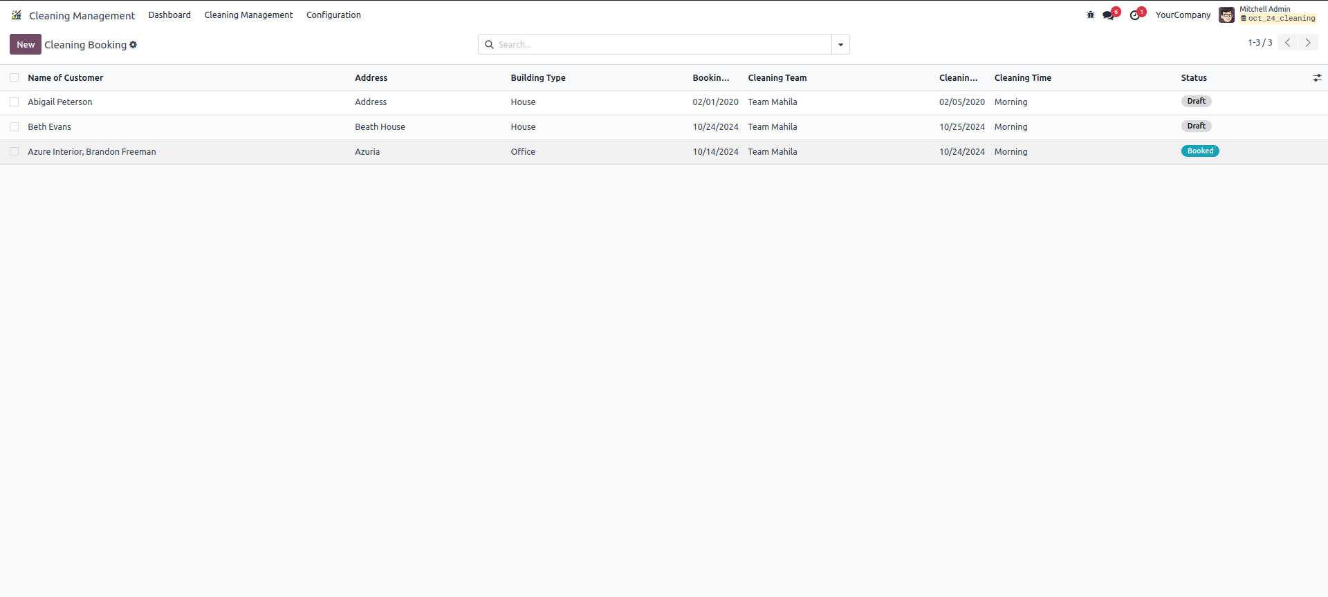 Cleaning Management -> Booking. Where all created bookings are listed, and you can also create a new booking here.
