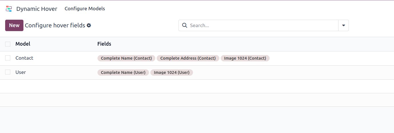 Go to Dynamic Hover -> New -> We can see the fields model and fields to configure.
