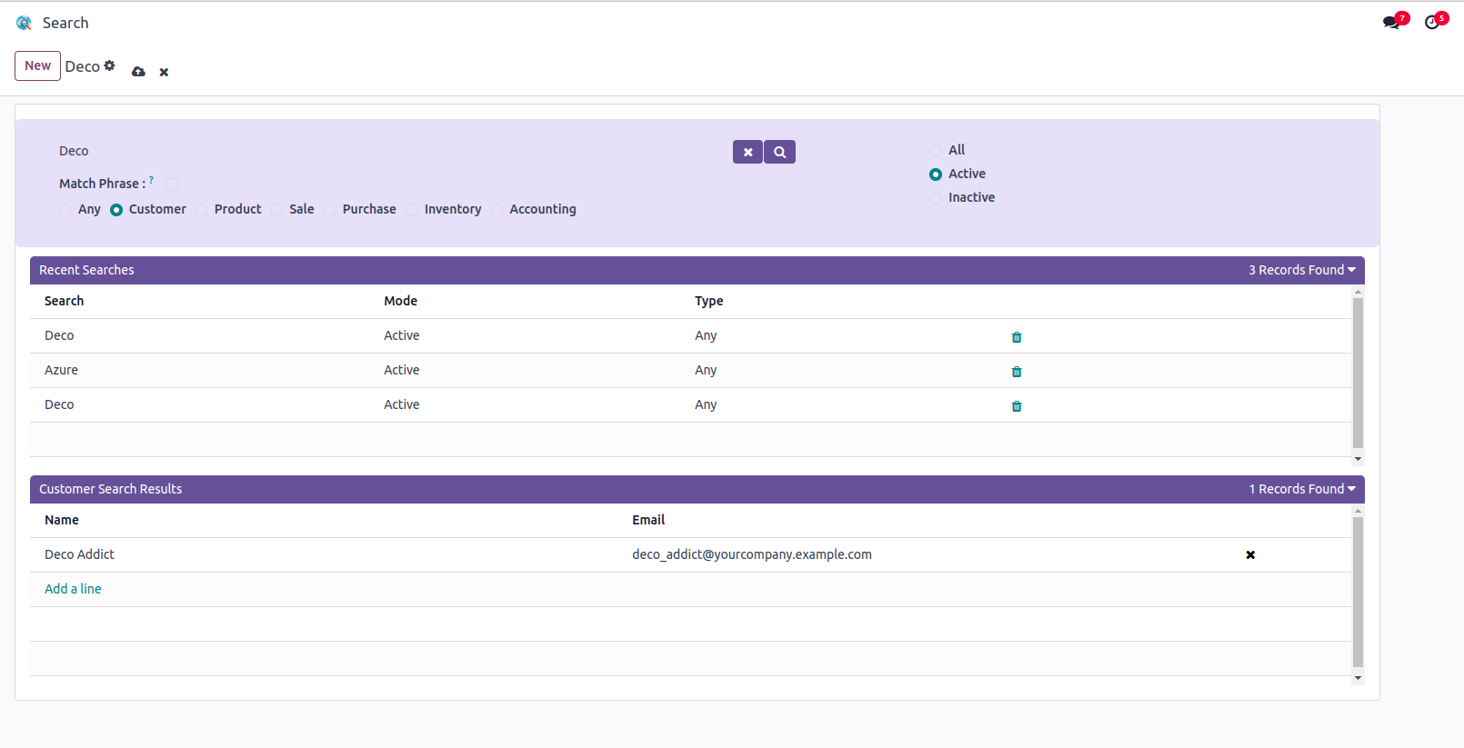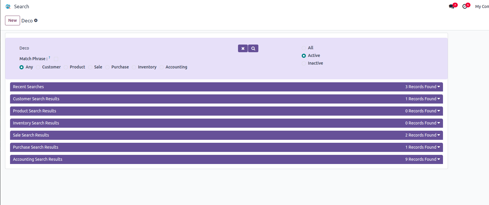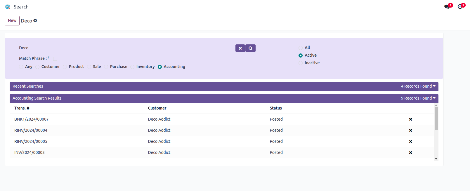 Users can search the records in Customers, Products, Sale, Purchase, Inventory and Accounting Modules.