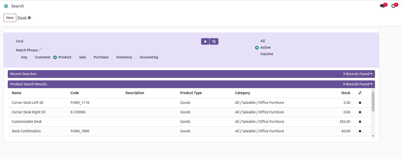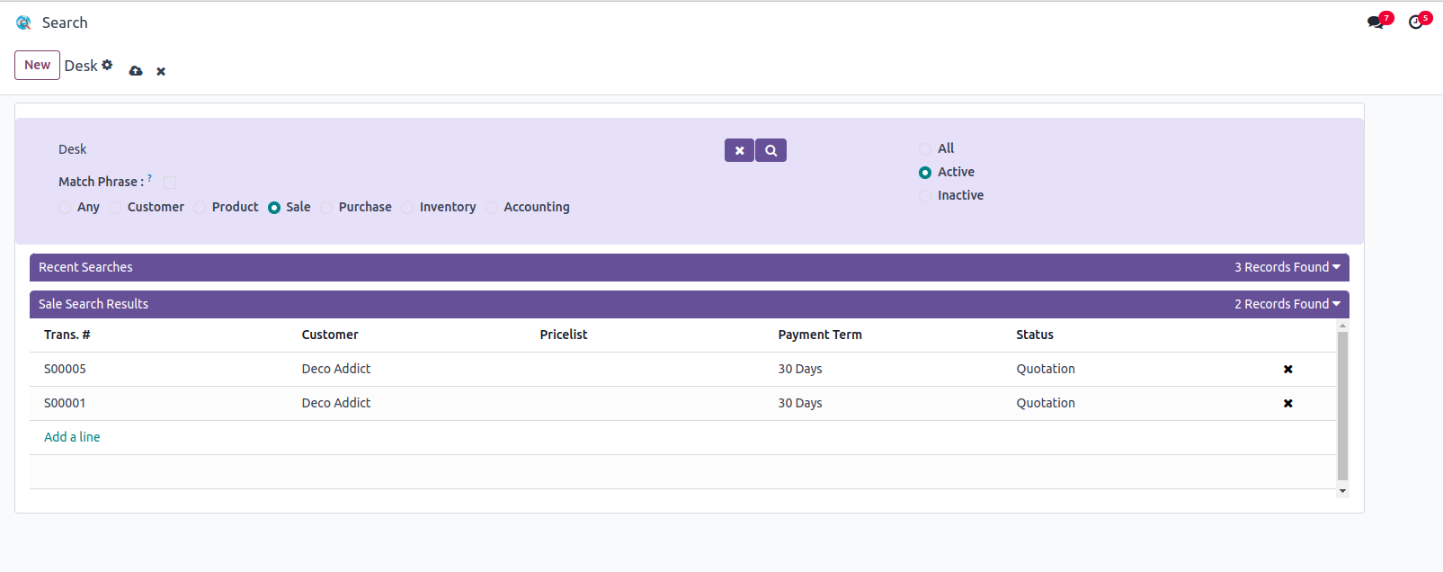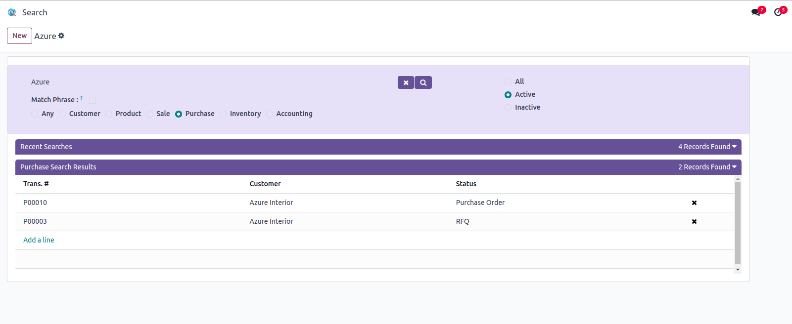 Users can search the records in Customers, Products, Sale, Purchase, Inventory and Accounting Modules.