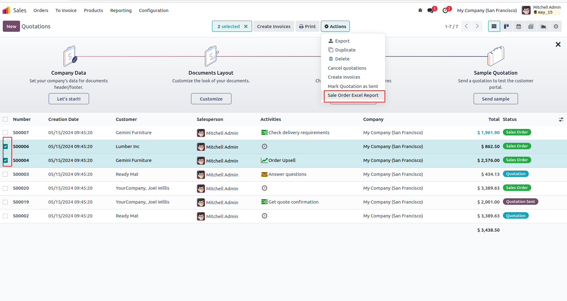 Go to Sales -> select records from the tree view for the sale order -> From the action menu -> Sale Order Excel Report