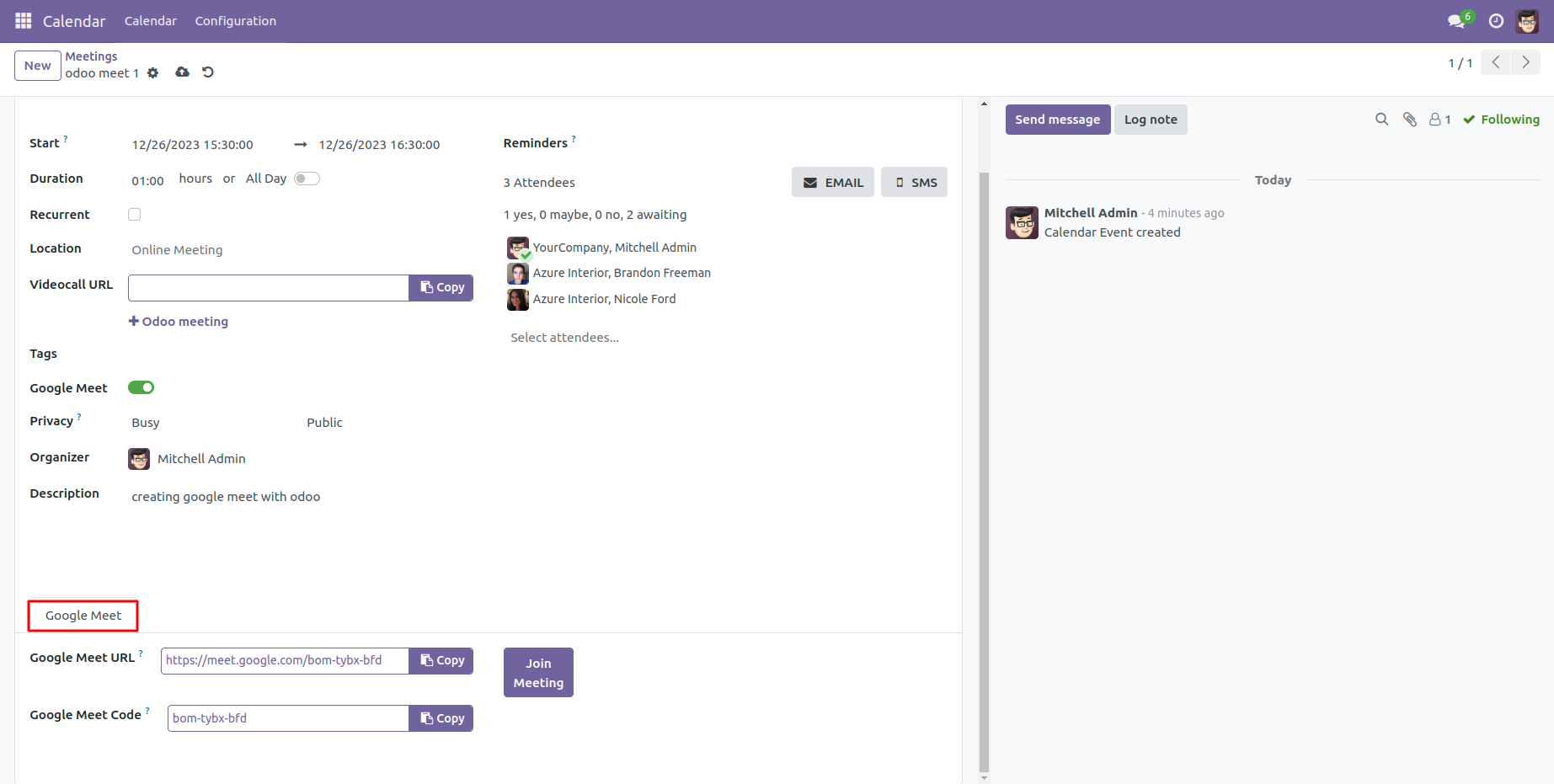 After successful authentication, now you can create Google Meetings to your Odoo calendar.