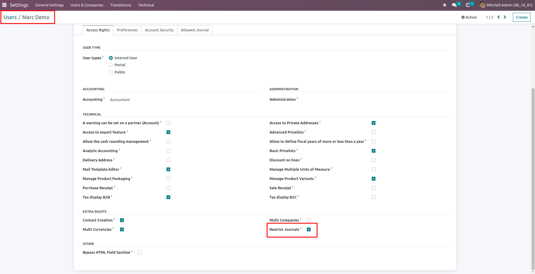 Go to Settings -> Users -> You can see a checkbox to enable restrict journal