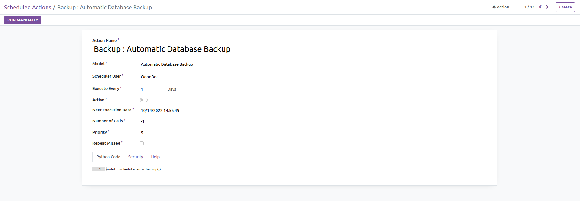 Enable the 'Automatic database Backup' scheduled action, and set up the execution interval. Based on the scheduled action setup, backups will be generated on regular intervals.