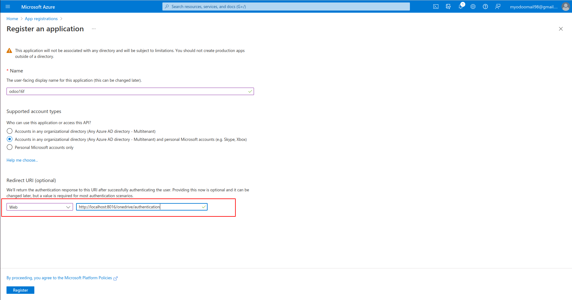 Select backup destination as onedrive. Enter the App key and App secret. you'll need to register a new app in the Microsoft Azure portal. While registering the app for the Redirect URI restrictions, copy your Odoo database URI followed by /onedrive/authentication. Example: