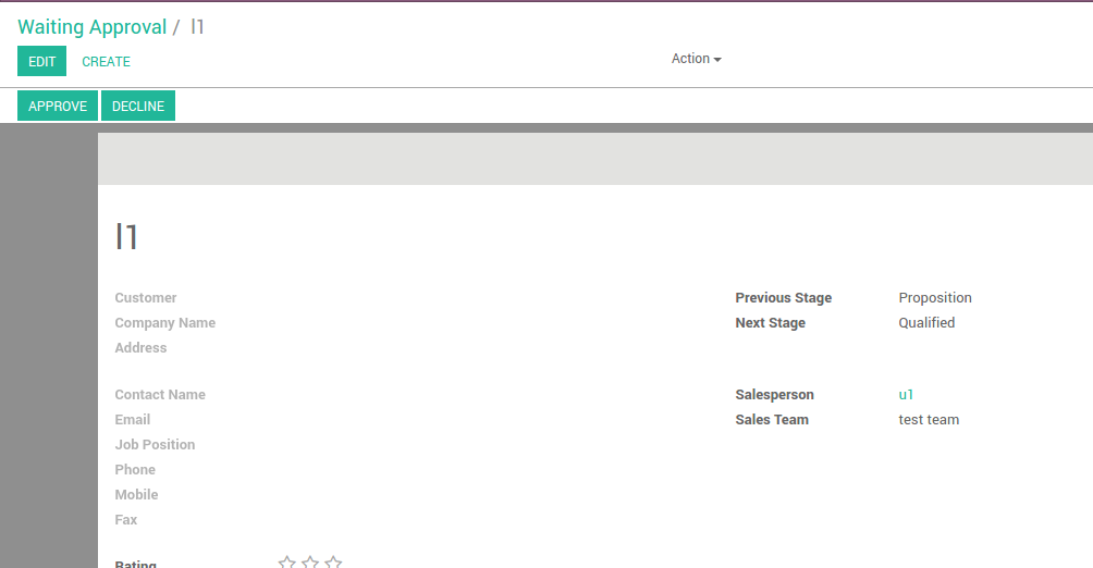 In the 'Waiting for Approval' stage, a lead will be visible only to the administrator, the user to which the lead is assigned to and the head of sales of team that the lead belongs to. When we select a lead in the 'Waiting for Approval' stage, we can see the stages, the lead comes from and where the lead is headed to.