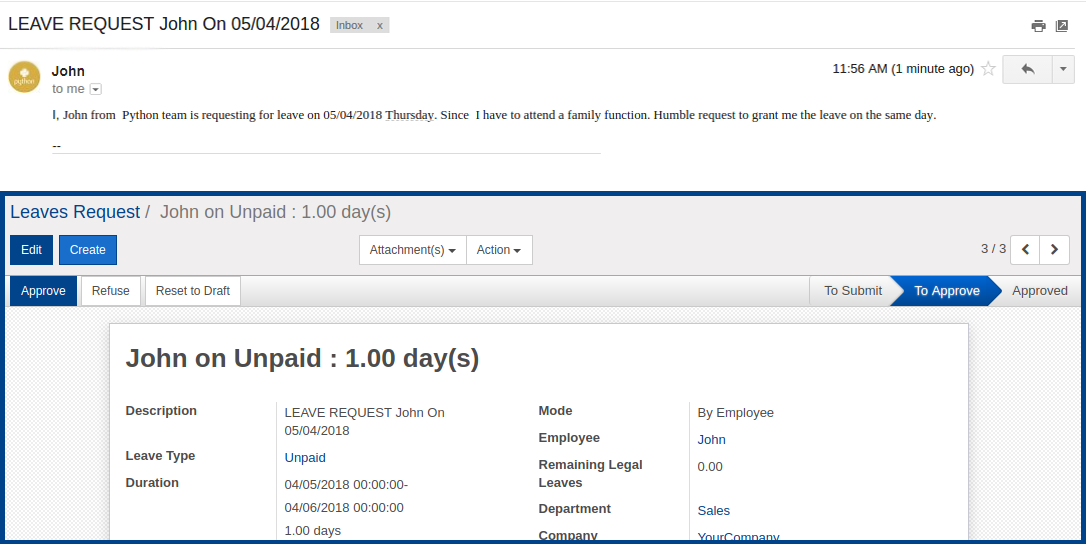 Email aliasing is a default feature in Odoo which allows the user to fetch contents to ERP records directly from incoming emails. The feature is a type of automation. Since we can configure the E-mails to fetch contents directly. So here we are providing one of the new module to create leave request automatically from incoming email.