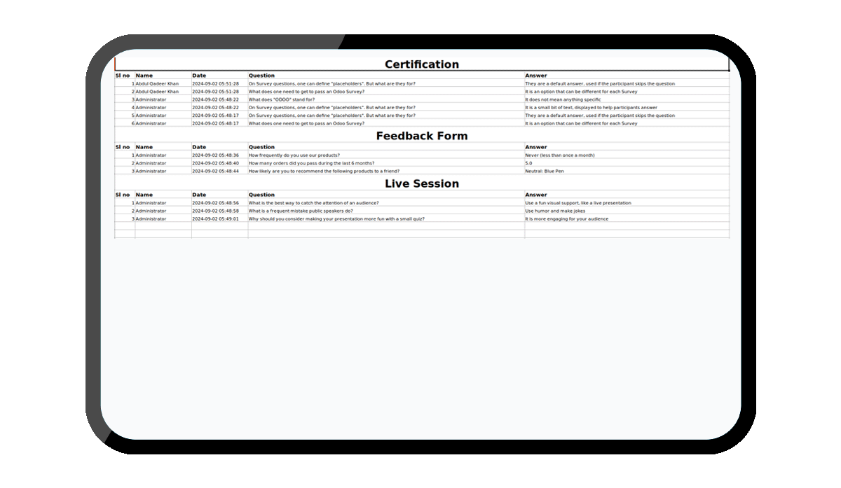 This Module helps to Export Survey Answers in XLSX Format. You can easily get the Questions and Answers of the Corresponding User.