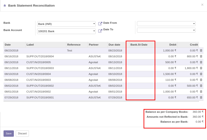 You can see the details about the current balance as per company books, bank balance based on already reconciled journal entries as 'Balance as per bank' and difference between them as 'Amount not reflected in Bank'