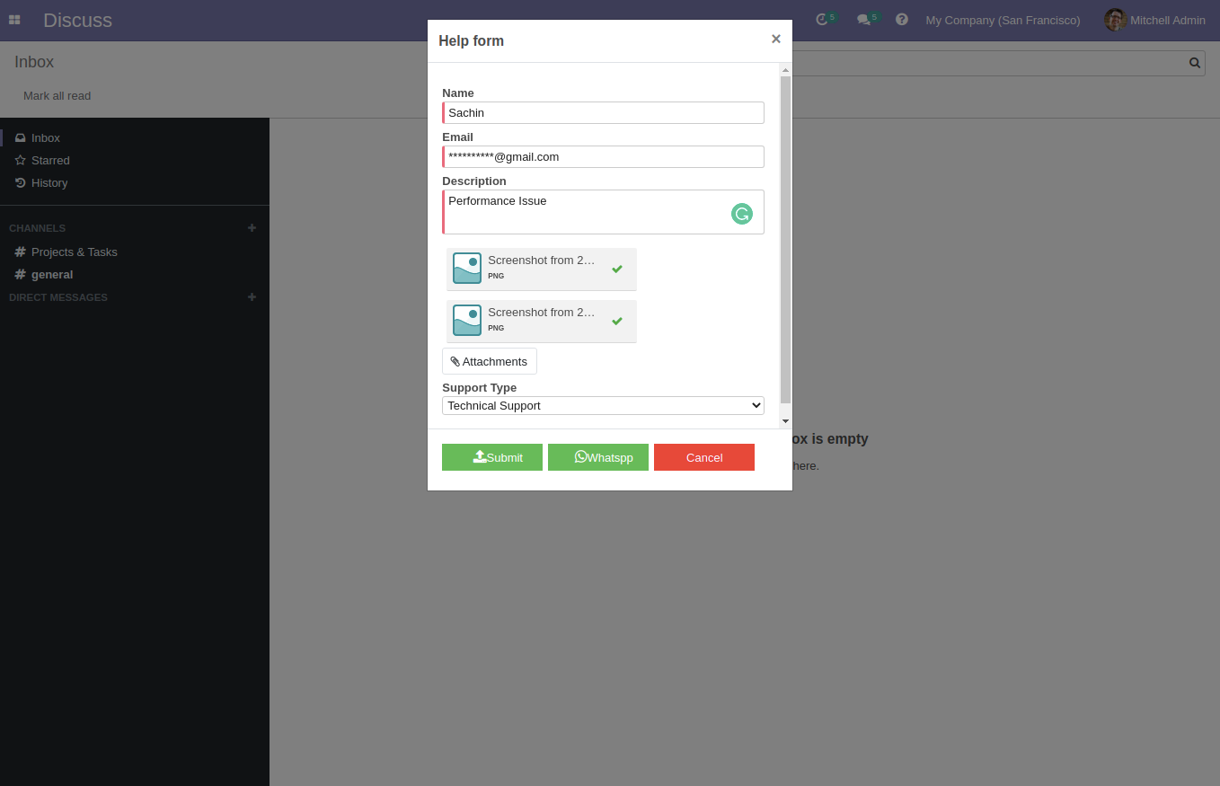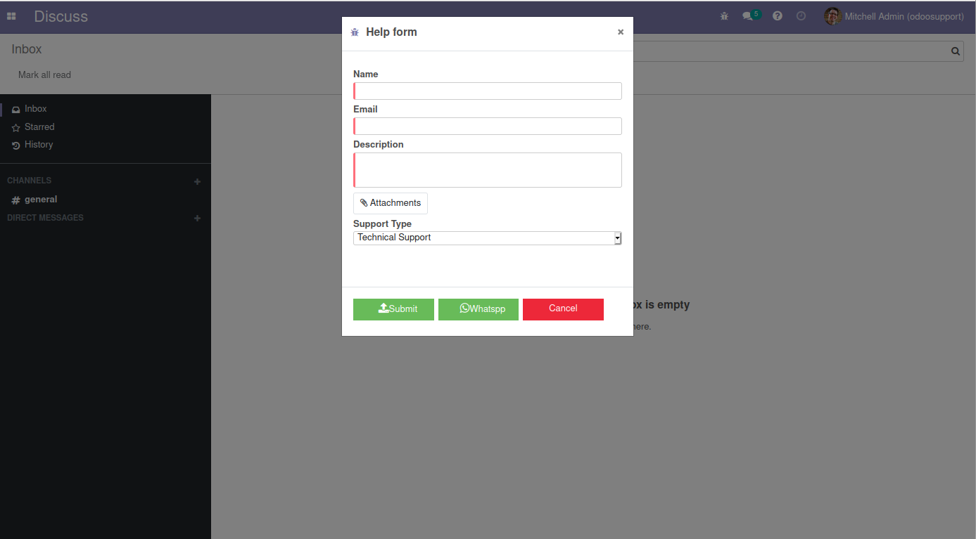 This modules helps user to raise support to Cybrosys Technologies(Odoo Support). User can seek support for both technical and functional aspects. One can seek support via email or whatsapp.