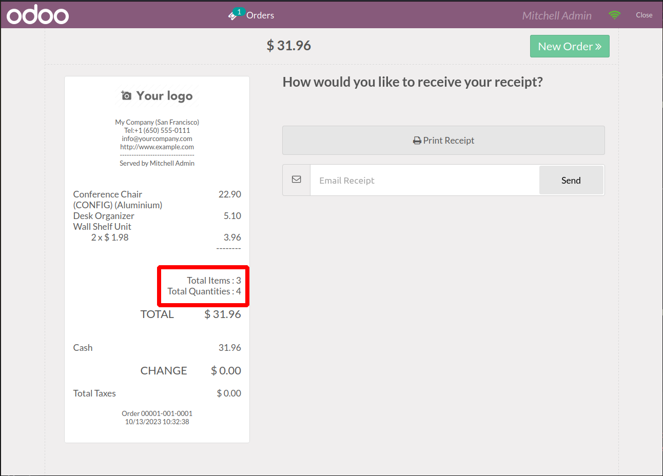 This module helps user to see the total items and quantities of products in PoS screen and bill also.