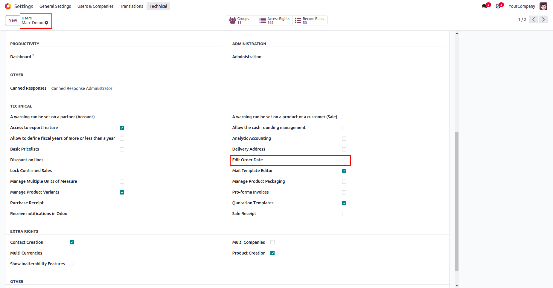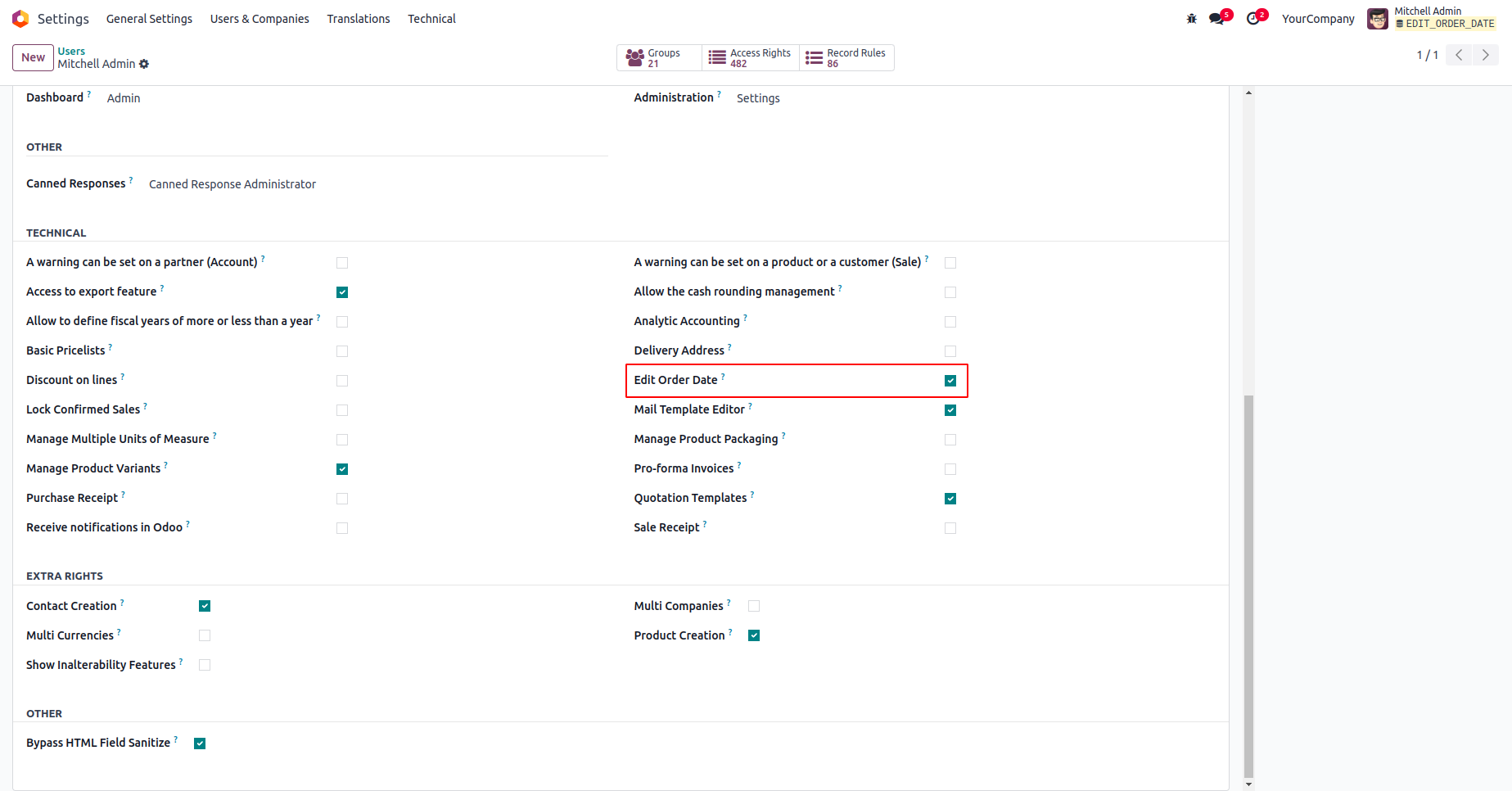 Access to edit the order date can be granted by enabling the 'Edit Order Date' field in the user's access rights.