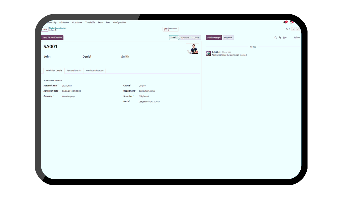 The module allows administrators to manage student applications, admissions, and enrollments. Student details, such as personal information, academic background, and course preferences, can be entered and tracked throughout their enrollment process.