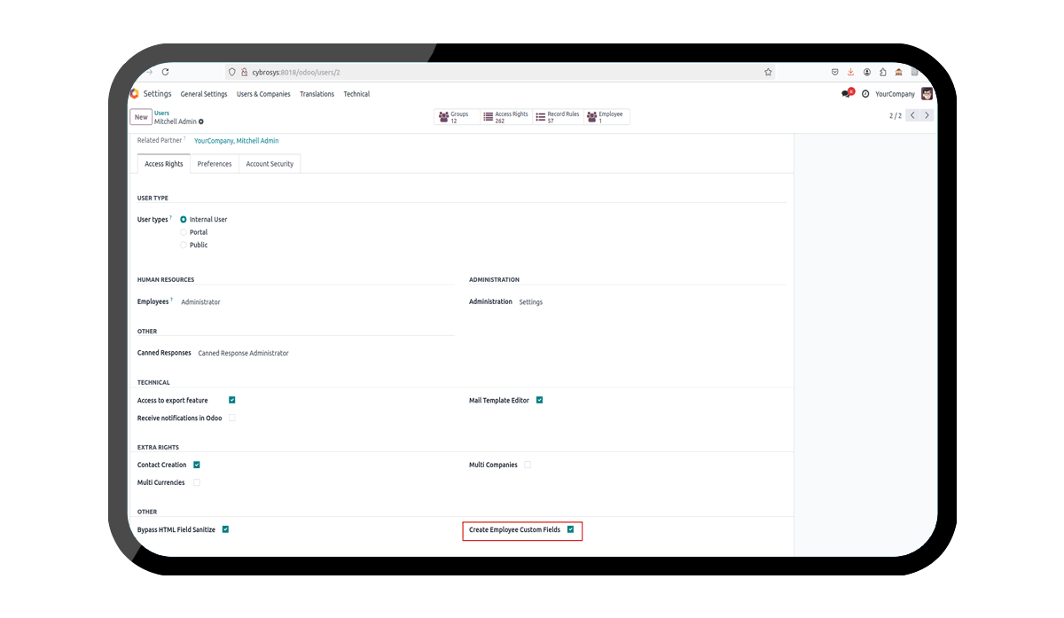 To give the user access to create Employee Custom Fields, go to the Settings menu and select Users and Company. Within that menu, select the user. In the User Access Rights tab, find the "Create Employee Custom Fields" option and enable it.