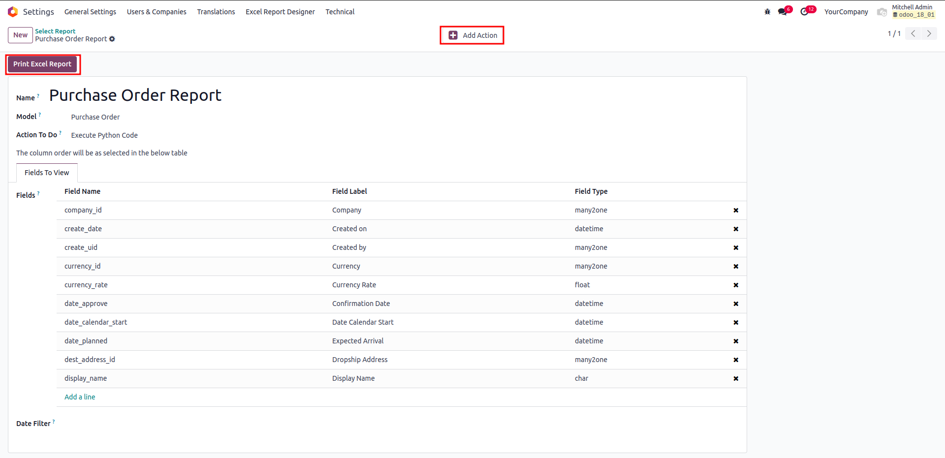 After configuring the report, there will be a button named 'Add action' in the form. By clicking it, the print option will be added the action menu of the corresponding model.