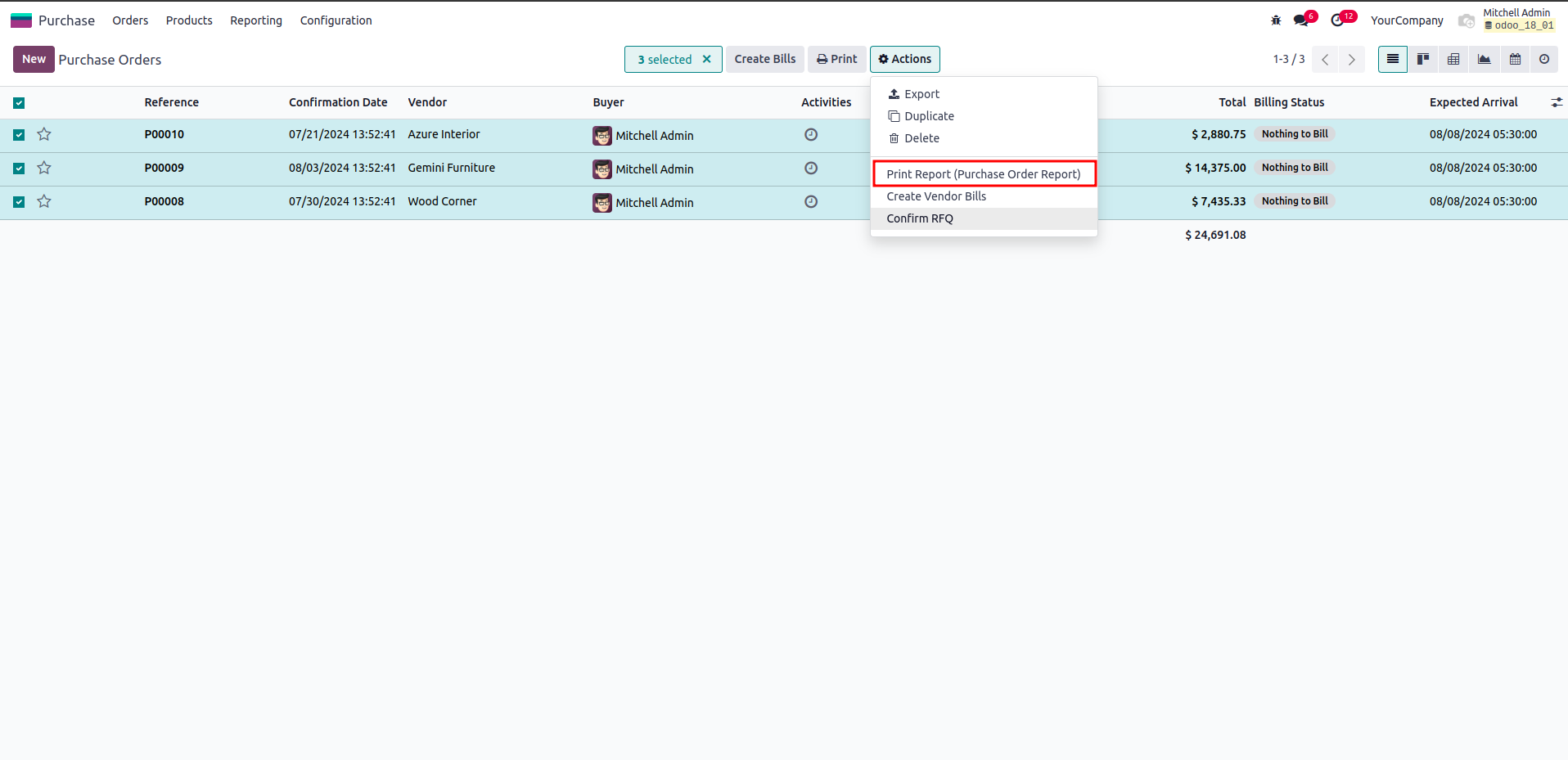 Print te report from the action menu of corresponding model after selecting the records.