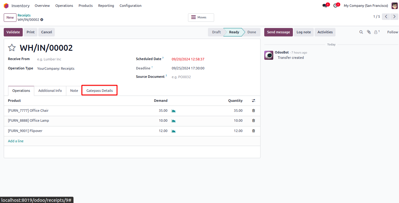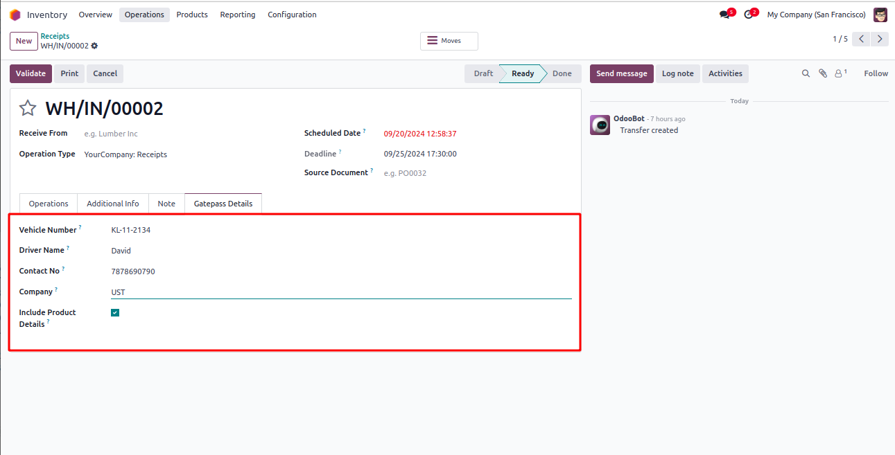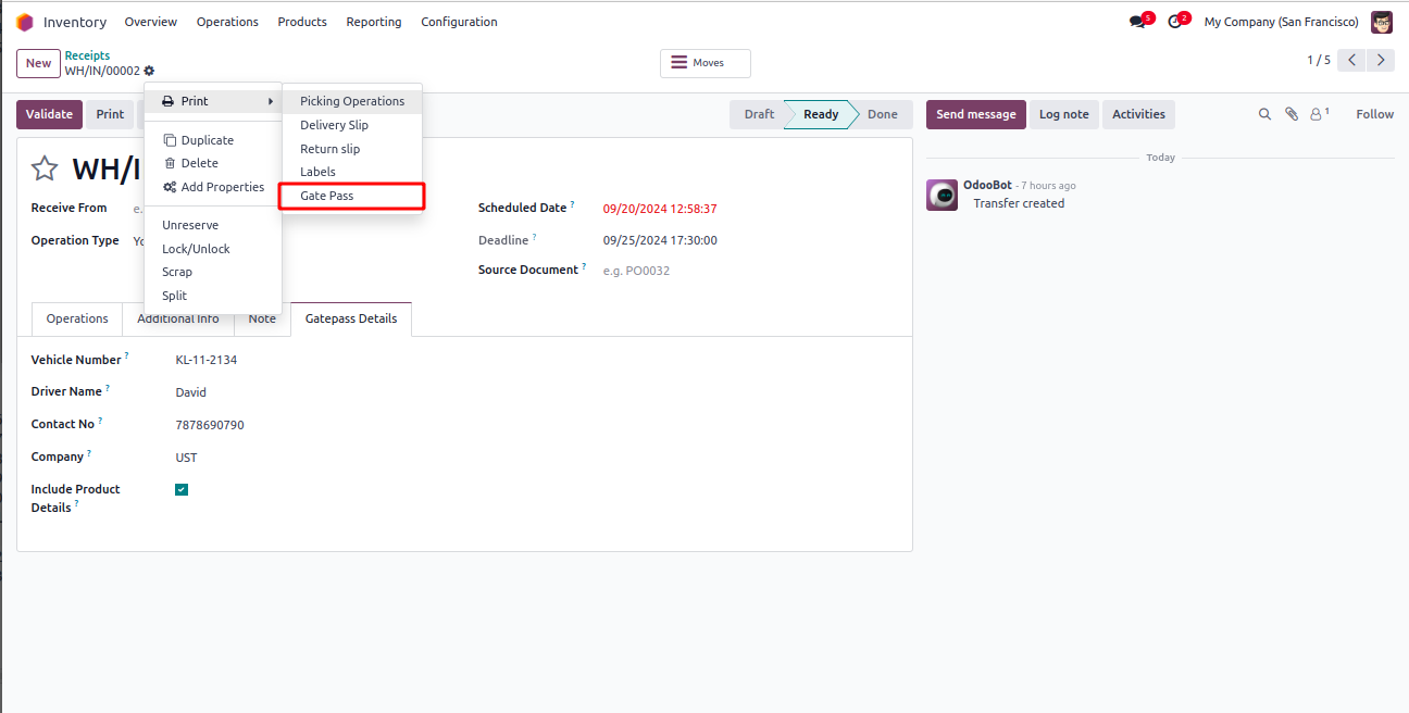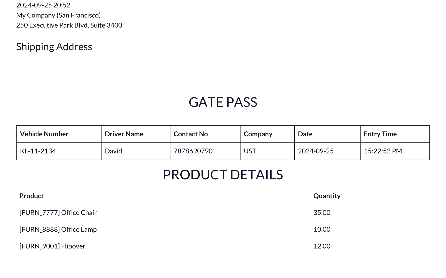 Gate pass modules make it possible to create gate pass tickets that include information on the driver, the firm to which the vehicle belongs, as well as the entry date and time,and the vehicle's details, additionally, as the product details listed in the delivery order.