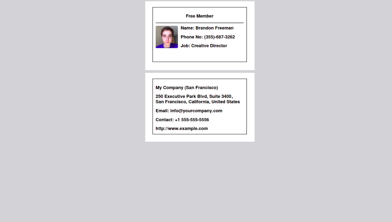 Result of free membership card which includes member details in front part and company details in other side.