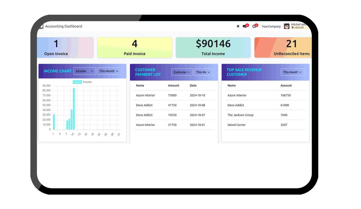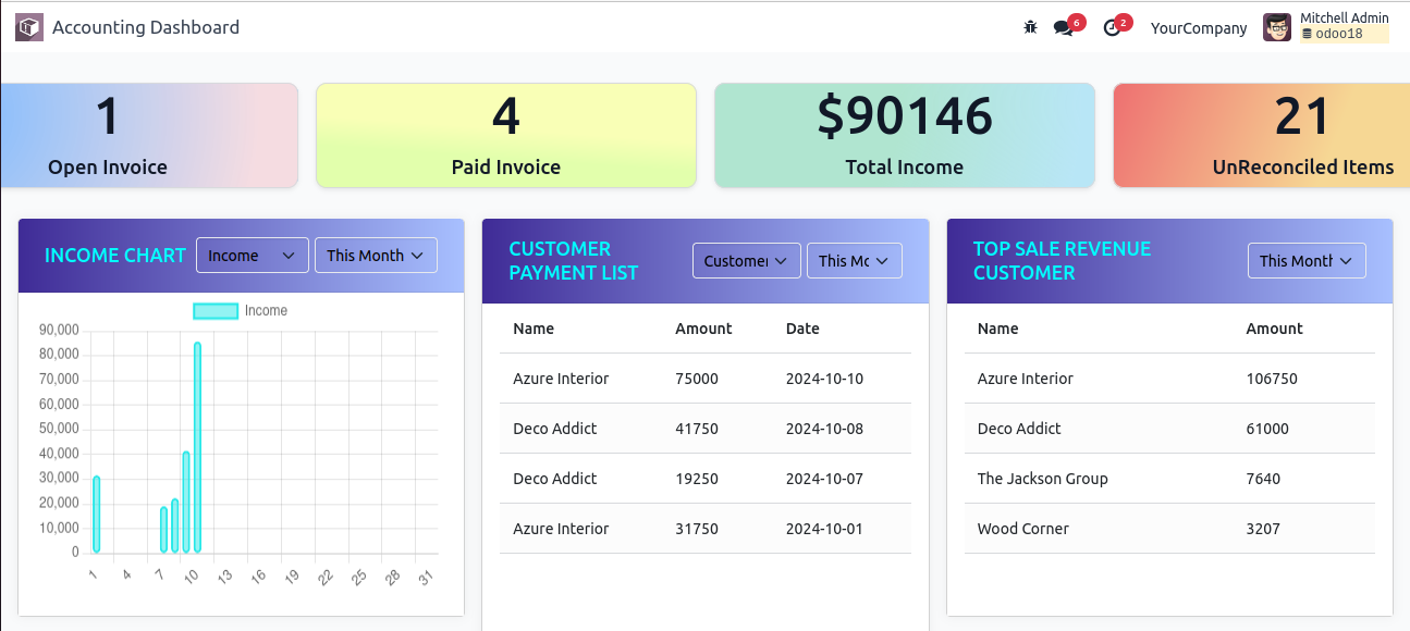 User can see different tiles of Open Invoice , Paid Invoice , Total Income , UnReconciled Items And different details of customer and Vendor Payment List, Bank And Cash Balance , Top Customers/Vendors and different charts of Income/Expense/Profit and Aged Receivables and Payables.
