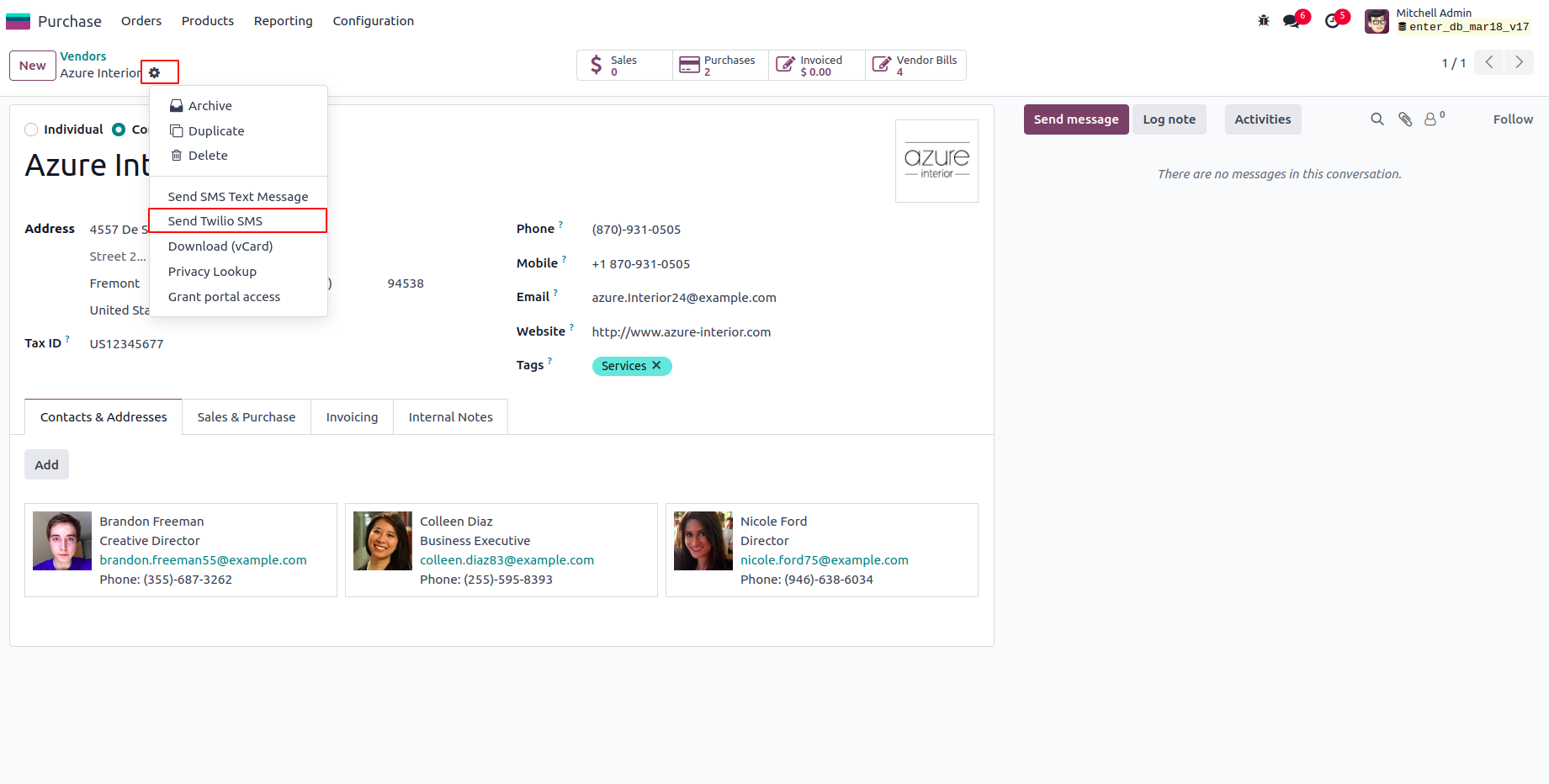 Twilio SMS from Partner's form view and Navigate to Send Twilio SMS under Action.