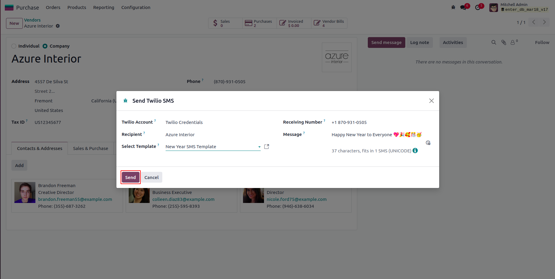 Create a Purchase Order and click Send SMS Via Twilio button to send the SMS from Purchase Order and Add the details then click Send button.