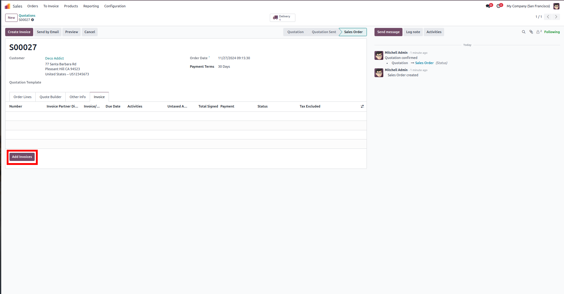 Click on the "Add Invoice" Button to link Invoices to the Sale Order.