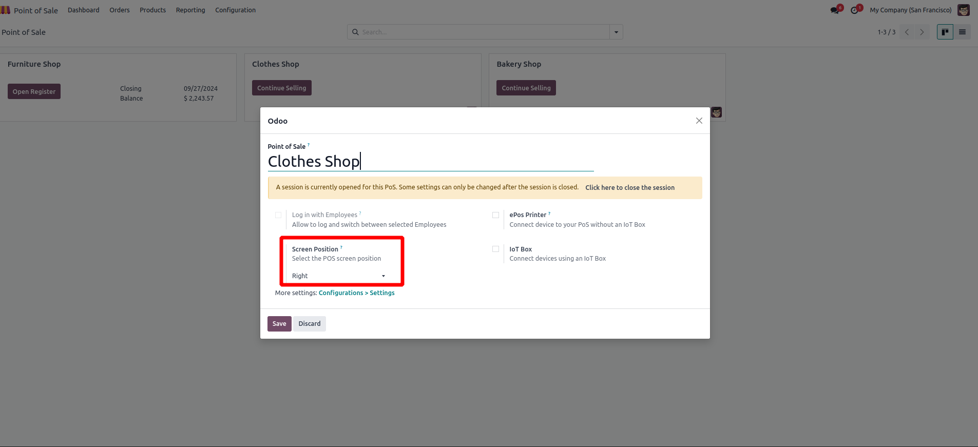 When we clicked the Edit button it will redirect to session settings, and here we can set the position of the screens. If the position is Right we can see the order screen on Right.