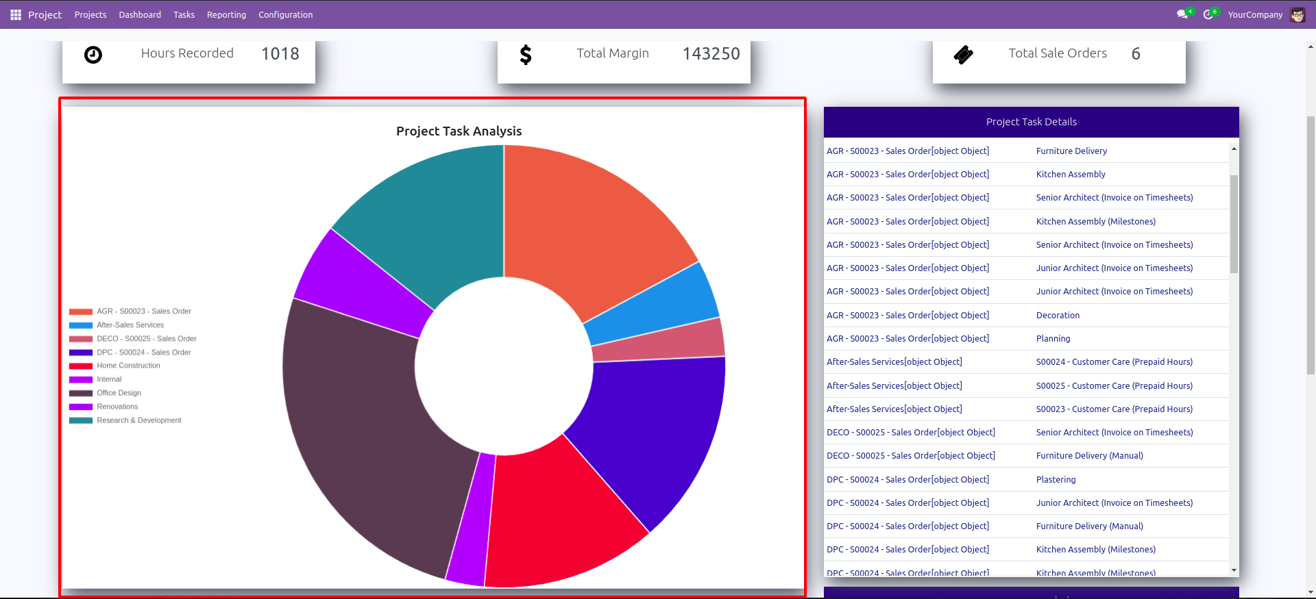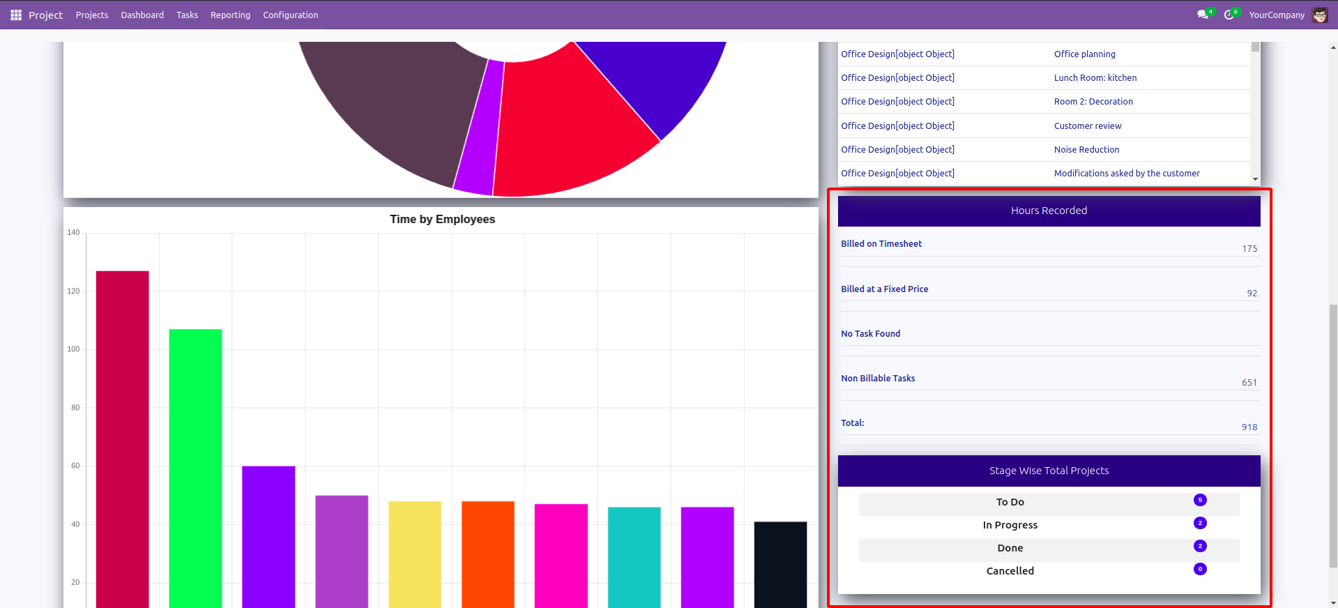 Project Dashboard has different types of Graphs that will give you a complete analyzing of the Project module.