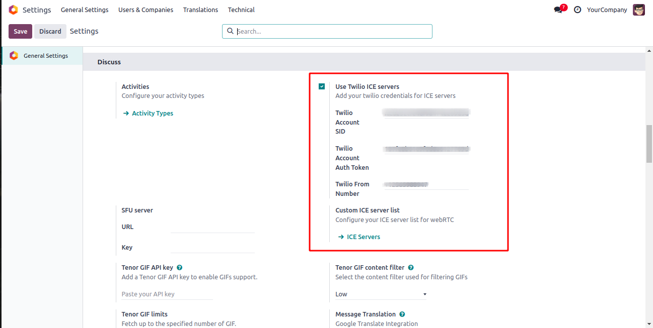 Update the Credentials in Odoo Settings > Use Twilio ICE servers