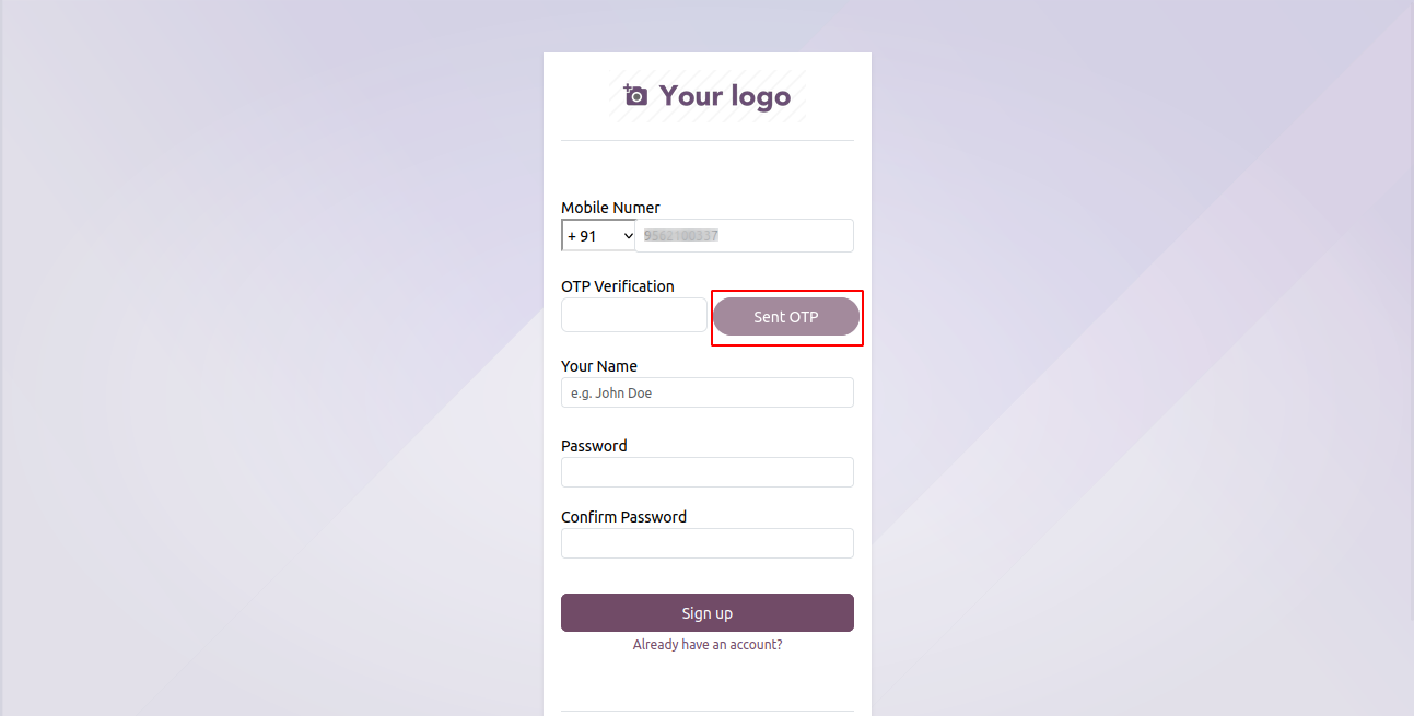 If you don’t receive the OTP, check if your mobile number was entered correctly. You can try requesting the OTP again by clicking "Send OTP". If the issue persists, ensure that your Twilio credentials are correctly configured in Odoo.